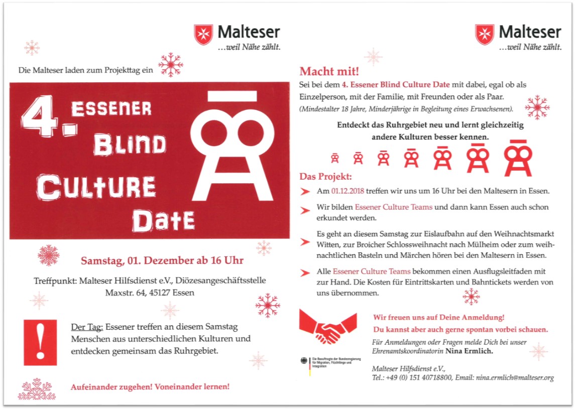Beginn der weitergeleiteten Nachricht: Datum: Mon, 19 Nov 2018 10:37:26 +0000 Von: "Ermlich, Nina" <Nina.Ermlich@malteser.org> An: "'fluchtfragen@unperfekthaus.de'" <fluchtfragen@unperfekthaus.de> Betreff: [fluchtfragen] Blind Culture Date Weihnachtsspezial ------------------------------------------------------------ Dies ist eine Mailingliste. Wenn du auf "antworten" klickst, dann geht das an 159 Leser Falls du nur dem Absender schreiben willst, dann schreibe an: Nina.Ermlich@malteser.org ------------------------------------------------------------ Sehr geehrte Damen und Herren, ich möchte Sie herzlich zum 4. Essener Blind Culture Date am Samstag den 01.Dezember 2018, um 16 Uhr in die Maxstraße 64 in 45127 Essen, einladen. Bei den bisherigen Blind Culture Dates ging es in die Villa Hügel, in das Museum Phänomania und letztes Mal in das Red Dot Design Museum. Vielen Dank an alle Teilnehmer für die schönen Tage! Beim nächsten Blind Culture Date gibt es ein Weihnachtsspezial! Wahlweise geht es zum Eislaufen auf den Wittener Weihnachtsmarkt, zur Broicher Schlossweihnacht nach Mühlheim oder wir verbringen einen gemütlichen traditionellen Weihnachtsnachmittag bei den Maltesern mit weihnachtlichen alkoholfreiem Apfelpunsch, Märchen und Basteln gemeinsam für Weihnachten. Ihr entscheidet! [cid:image001.jpg@01D47FFC.3D3BEA90] Mit freundlichen Grüßen Nina Ermlich Koordinatorin Integrationsdienste Malteser Hilfsdienst e.V. Diözese Essen / Bezirk Ruhrgebiet Maxstr. 64, 45127 Essen Telefon +49 (0) 201 82047-23 Mobil +49 (0) 151 40718800 Fax +49 (0) 201 82047- 12 E-Mail Nina.Ermlich@Malteser.org<mailto:Thomas.Hanschen@malteser.org> Web www.malteser-essen.de<http://www.malteser.de/> Malteser Hilfsdienst e.V., Sitz: Köln, AG Köln VR 4726, Geschäftsführender Vorstand: Cornelius Freiherr von Fürstenberg; Verena Hölken; Dr. Elmar Pankau (Vors.); Douglas Graf von Saurma-Jeltsch -- Dies ist die Mailingliste, in der die Beteiligten des Projekts http://www.unperfekthaus.de/projekte/fluchtfragen untereinander kommunizieren können. Es sind 159 Teilnehmer in der Liste eingetragen. Auch Interessenten haben die Möglichkeit, über diese Mailingliste Kontakt mit allen Beteiligten aufzunehmen. Solche Anfragen bitte einfach durch "Antworten" an die Liste beantworten und den Eintrag im "Betreff" der Antwort-Mail unverändert lassen. Nur dann bekommen alle anderen Beteiligten und auch der anfragende Interessent eine Kopie der Antwort. Hinweis: Die UpH-Verwaltung ist automatisch auch Teilnehmer dieser Mailingliste. Private Dinge also bitte nicht über diese Mailingliste, sondern in privaten Mails. Unperfekthaus - DIE OASE IN DER STADT ESSEN Täglich ab 7 Uhr (So. ab 8 Uhr) geöffnet, der Eintritt beinhaltet beliebig viel Cola, Limo, Wasser, Säfte, Kaffee, Tee, Milchkaffee,... Inh. Reinhard Wiesemann, Friedrich-Ebert-Str. 18, 45127 Essen-City, UStID DE 180305557, https://www.unperfekthaus.de/datenschutz Interessiert am Unperfekthaus selbst? https://www.unperfekthaus.de/newsletter "The enemy is fear. We think it is hate; but it is really fear." - Mahatma Gandhi Zum Austragen aus der Mailingliste bitte diesen Link aufrufen: http://www.unperfekthaus.de/unsbmlgwhh-v5xs-s7v9-martinkesz [:XqG] Viele Grüße Martin -- Öffentliches Meet & Talk jeden Di 16-18 Uhr in der Zentralbib Öffentliche Beratungsstunde jeden Mi 17-19 Uhr Feidikstr.27 -- Spenden ohne Kosten: https://smile.amazon.de/ch/322-593-41312 https://www.wecanhelp.de/459065004/spendenprojekt -- Tel.: 0176/48310835 http://fluechtlingshilfe-hamm.de https://www.facebook.com/fluechtlingshilfeHamm http://fluechtlingshilfe-hamm.de/data/_uploaded/file/Beitrittserklaerung.pdf -- Spenden: BIC: WELADED 1 HAM IBAN: DE58410500950021224860