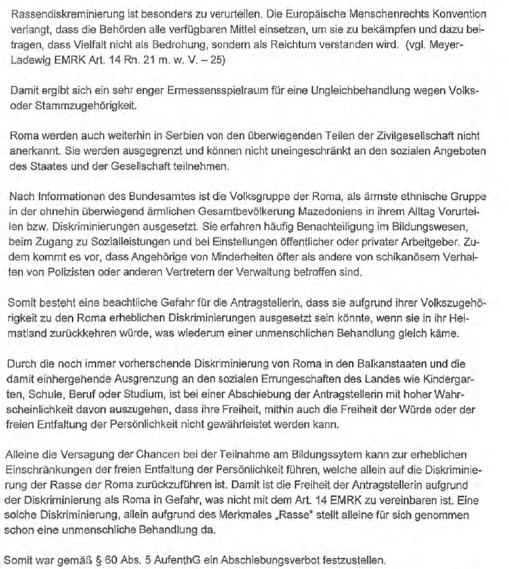 Beginn der weitergeleiteten Nachricht: Datum: Tue, 17 Jan 2017 22:19:53 +0100 Von: Claudius Voigt <voigt@ggua.de> An: liste-muensterland@asyl.org Betreff: [liste-muensterland] Positiver BAMF-Bescheid für Romni aus Mazedonien wegen Verletzung des Diskriminierungsverbots (Art. 14 EMRK) Liebe Kolleg*innen, im Anhang ein bemerkenswerter positiver BAMF-Bescheid, in dem einem einjährigen Kind (Roma-Angehörige, Mazedonien) ein nationales Abschiebungsverbot wegen Verletzung des Diskriminierungsverbots gem. Art. 14 EMRK zugesprochen wurde. Liebe Grüße Claudius -- Claudius Voigt Projekt Q - Büro für Qualifizierung der Flüchtlings- und Migrationsberatung Gemeinnützige Gesellschaft zur Unterstützung Asylsuchender e.V. (GGUA Flüchtlingshilfe) Hafenstraße 3-5 48153 Münster Fon: 0251 14486-26 Mob: 01578 0497423 Fax: 0251 14486-20 voigt@ggua.de www.ggua.de www.einwanderer.net Das Projekt Q wird gefördert aus Mitteln des Bundesministeriums für Familien, Senioren, Frauen und Jugend (BMFSFJ) sowie durch das Ministerium für Inneres und Kommunales des Landes NRW (MIK). Das Projekt Q ist Teilprojekt im IQ Netzwerk Niedersachsen. Das Förderprogramm „Integration durch Qualifizierung (IQ)“ wird durch das Bundesministerium für Arbeit und Soziales (BMAS) gefördert. In Kooperation mit dem Bundesministerium für Bildung und Forschung (BMBF) sowie der Bundesagentur für Arbeit (BA). Die GGUA Flüchtlingshilfe ist Mitglied im Paritätischen Wohlfahrtsverband (DPWV). Falls Sie im Bereich der Flüchtlingsarbeit in NRW auf dem Laufenden bleiben wollen - hier können Sie sich in die "Infoliste Münsterland" eintragen: http://www.ggua.de/ggua/fuer-den-newsletter-anmelden/ --- Diese E-Mail wurde von Avast Antivirus-Software auf Viren geprüft. https://www.avast.com/antivirus Viele Grüße Martin -- Tel.: 0176/48310835 http://fluechtlingshilfe-hamm.de https://www.facebook.com/fluechtlingshilfeHamm http://fluechtlingshilfe-hamm.de/data/_uploaded/file/Beitrittserklaerung.pdf Spenden: BIC: WELADED 1 HAM IBAN: DE58410500950021224860 _______________________________________________ liste-muensterland mailing list liste-muensterland@asyl.org http://www.asyl.org/mailman/listinfo/liste-muensterland