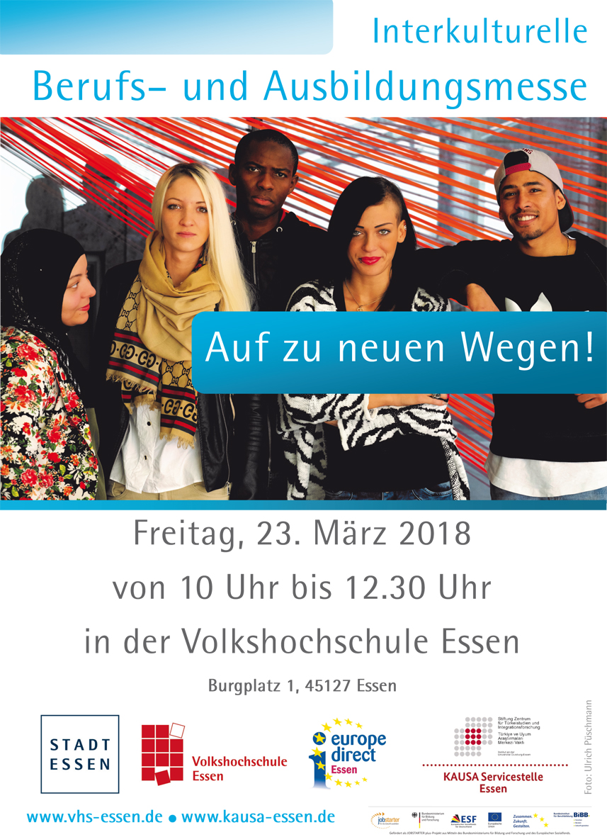 Beginn der weitergeleiteten Nachricht: Datum: Fri, 23 Feb 2018 11:33:51 +0100 Von: Cem Şentürk <sentuerk@zfti.de> An: <fluchtfragen@unperfekthaus.de> Betreff: [fluchtfragen] [#sVK6] Interkulturelle Berufs- und Ausbildungsmesse ------------------------------------------------------------ Dies ist eine Mailingliste. Wenn du auf "antworten" klickst, dann geht das an 166 Leser Falls du nur dem Absender schreiben willst, dann schreibe an: sentuerk@zfti.de ------------------------------------------------------------ Sehr geehrte Damen und Herren, am 23. März 2018 zwischen 10 Uhr und 12:30 Uhr präsentieren die VHS Essen und die KAUSA Servicestelle Essen die "Interkulturelle Berufs- und Ausbildungsmesse. Auf zu neuen Wegen!". Ziel der Messe ist es, Berührungsängste zwischen Jugendlichen und Unternehmen abzubauen und zu einer intensiven Auseinandersetzung über Berufsperspektiven anzuregen. Rund 30 namhafte regionale und überregionale Arbeitgeber und erfolgreiche Migrantenbetriebe nehmen als Aussteller an der Messe teil und stellen ihre Praktikums- und Ausbildungsmöglichkeiten vor, die von rund 500 Schüler*innen besucht wird. Zu Beginn der Messe findet eine zwanzigminutige Kick-off-Veranstaltung statt, die von den Schüler*innen der VHS Essen organisiert wird. Am Stand der KAUSA Servicestelle Essen werden mehrsprachige Berater*innen zur Verfügung stehen, die den Jugendlichen mögliche Chancen durch eine duale Ausbildung aufzeigen und in mehreren Sprachen (Arabisch, Deutsch, Farsi, Englisch, Türkisch) informieren. Im Anhang finden Sie das Plakat der Messe. Aufgrund der Kapazitätsgrenzen können wir leider nur die vorangemeldeten Gruppen in die Messe einbinden. Daher möchten wir Sie bitten, bis 16. März 2018 Frau Sabine Gawlitta, VHS Essen (0201 88-43137 / <mailto:Sabine.Gawlitta@vhs.essen.de> Sabine.Gawlitta@vhs.essen.de) zu kontaktieren, falls Sie Kontingente für Ihre Schüler*innen reservieren möchten. Wir freuen uns auf Ihren Besuch! Mit freundlichen Grüßen Cem Şentürk Leiter ----------------------------------------------- KAUSA Servicestelle Essen (KSE) Altendorferstr. 3 D-45127 Essen Tel: +49.201.31.98.106 Fax:+49.201.31.98.333 <mailto:sentuerk@kausa-essen.de> sentuerk@kausa-essen.de <http://www.kausa-essen.de/> www.kausa-essen.de "Gefördert als JOBSTARTER plus-Projekt aus Mitteln des Bundesministeriums für Bildung und Forschung und dem Europäischen Sozialfonds der Europäischen Union" cid:image004.jpg@01D04AB5.F27F4F30 Bitte denken Sie an die Umwelt, bevor Sie ein Dokument drucken. / Lütfen çıktı almadan önce çevreye olan sorumluluğumuzu bir kez daha düşünelim. / Please consider the environment before printing any document. -- Dies ist die Mailingliste, in der die Beteiligten des Projekts http://www.unperfekthaus.de/projekte/fluchtfragen untereinander kommunizieren können. Es sind 166 Teilnehmer in der Liste eingetragen. Auch Interessenten haben die Möglichkeit, über diese Mailingliste Kontakt mit allen Beteiligten aufzunehmen. Solche Anfragen bitte einfach durch "Antworten" an die Liste beantworten und den Eintrag im "Betreff" der Antwort-Mail unverändert lassen. Nur dann bekommen alle anderen Beteiligten und auch der anfragende Interessent eine Kopie der Antwort. Hinweis: Die UpH-Verwaltung ist automatisch auch Teilnehmer dieser Mailingliste. Private Dinge also bitte nicht über diese Mailingliste, sondern in privaten Mails. UNPERFEKTHAUS - Künstlerdorf, Kneipe, Hotel Friedrich-Ebert-Str. 18, 45127 Essen-City Tel.: 0201/470 916 0, http://www.unperfekthaus.de Mo-Do 7-23Uhr, Fr&Sa 7-24Uhr, So 8-23 Uhr 6,90 Euro Eintritt inkl. alkfreier Getränkeflatrate Tolle Büffets, Seminar- und Partyräume für Firmen und Privatleute. Selbst Parties, bei denen jede(r) Essen mitbringt sind möglich! Das UpH auf Facebook: http://facebook.com/unperfekthaus Zum Austragen aus der Mailingliste bitte diesen Link aufrufen: http://www.unperfekthaus.de/unsbmlgwhh-v5xs-s7v9-martinkesz [:XqG] Viele Grüße Martin -- Öffentliches Meet & Talk jeden Di 15-18 Uhr in der Zentralbib Öffentliche Beratungsstunde jeden Mi 17-19 Uhr Feidikstr.27 -- Spenden ohne Kosten: https://smile.amazon.de/ch/322-593-41312 https://www.wecanhelp.de/459065004/spendenprojekt -- Tel.: 0176/48310835 http://fluechtlingshilfe-hamm.de https://www.facebook.com/fluechtlingshilfeHamm http://fluechtlingshilfe-hamm.de/data/_uploaded/file/Beitrittserklaerung.pdf -- Spenden: BIC: WELADED 1 HAM IBAN: DE58410500950021224860